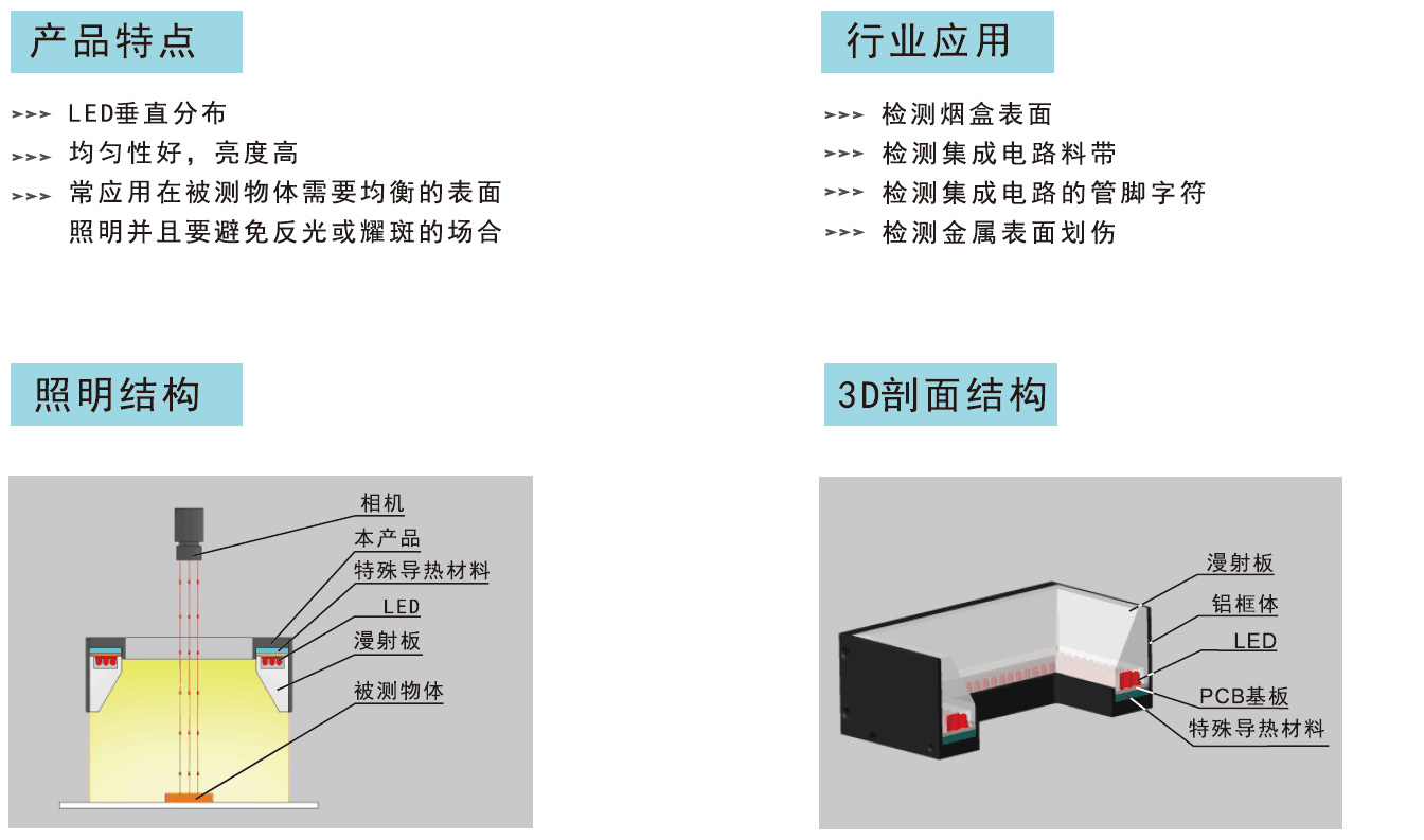 采用獨(dú)特的照明結(jié)構(gòu),LED發(fā)出的光以過(guò)特殊光學(xué)材料均勻照射,同時(shí)采用柔性線路板以90度照射角度固定,經(jīng)折射后照射在被測(cè)物體上,對(duì)目標(biāo)區(qū)域進(jìn)行高效、均勻照明,主要應(yīng)用于檢測(cè)物體需要均衡的表面照明并且要避免反光和耀斑的場(chǎng)合。