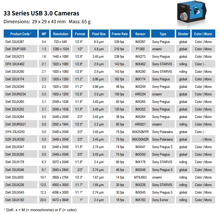 The Imaging Source 33系列提供 Sony 及 onsemi 最廣 泛的全局與卷簾快門CMOS傳感器選擇。 分辨率范圍自0.4 MP至20 MP (幀速率高達(dá)539 fps - 使用 ROI時(shí)更高),此功能齊全的相機(jī)系列為幾乎所有機(jī)器視 覺應(yīng)用提供了價(jià)值驅(qū)動(dòng)的成像解決方案。 此系列面陣掃描工業(yè)相機(jī)亦提供 GigE 接口,以輕盈精巧 的外形提供高性能成像。