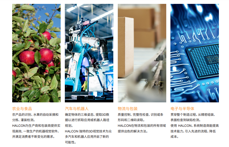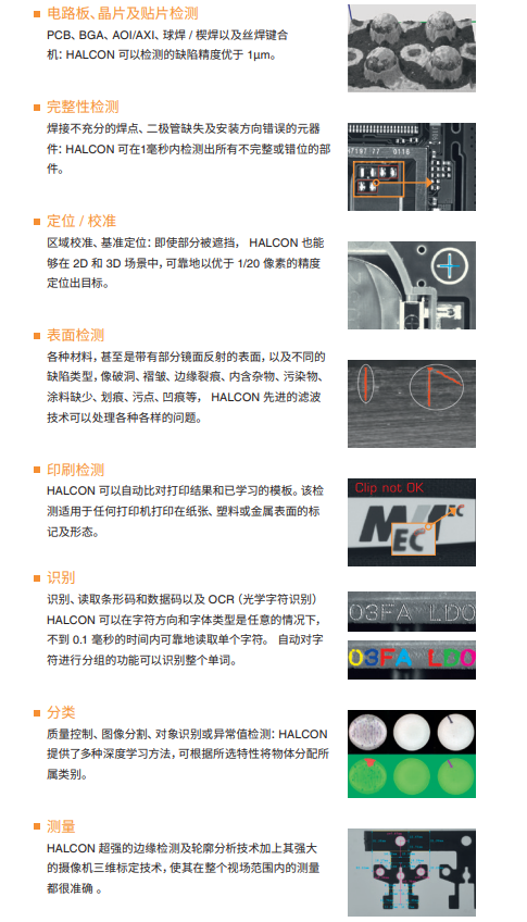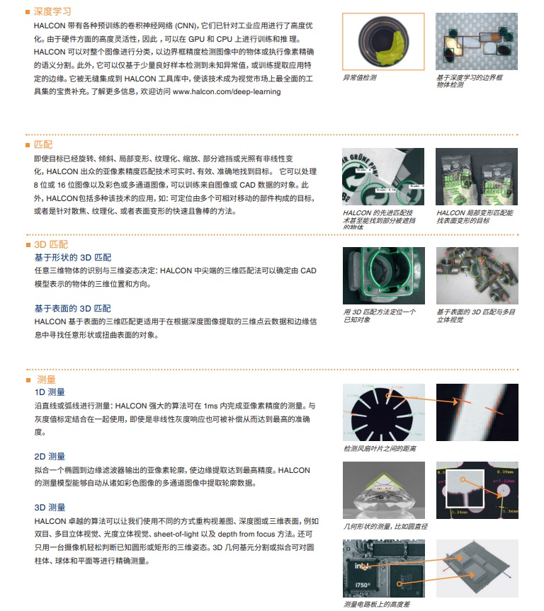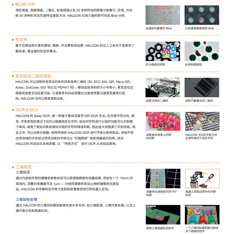 MVTec HALCON 提供了卓越的性能, 并全面地支持多核平臺(tái)和特殊指令集 (如AVX2和 NEON),以及 GPU 加 速。HALCON 可應(yīng)用于所有行業(yè),其提供的函數(shù)庫(kù)已被使用在數(shù)十萬(wàn)套各 行各業(yè)的裝置中,包括 Blob 分析,形態(tài) 學(xué),匹配,測(cè)量和識(shí)別等。 HALCON 軟件提供了最新最先進(jìn)的機(jī)器視覺(jué)技 術(shù),如全面的三維視覺(jué)和深度學(xué)習(xí)算 法。此外, MVTec 有豐富的視覺(jué)開發(fā) 經(jīng)驗(yàn),為客戶提供 HALCON 的免費(fèi)技術(shù)支持。